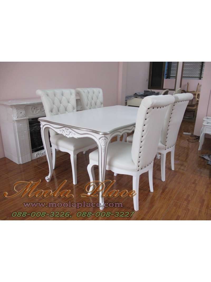 โต๊ะรับประทานอาหารแกะลายหลุยส์ ทำสีพ่นขาวเดินเงิน ขนาด 160 x 90 x 75 ซม.