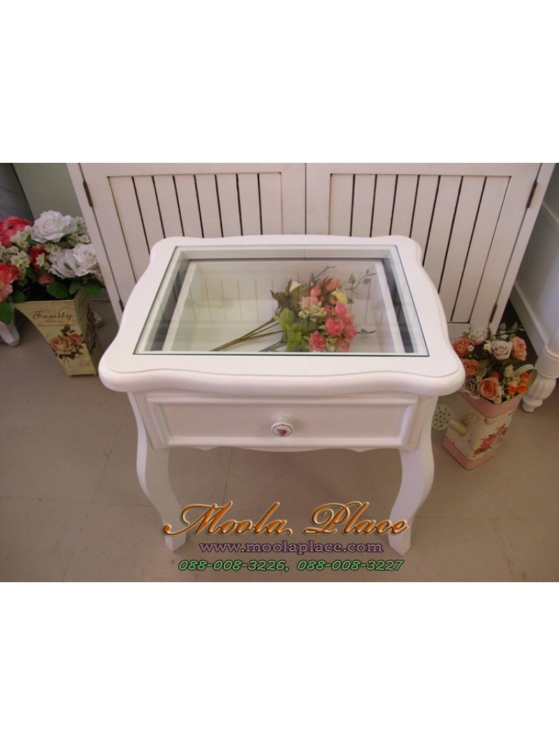โต๊ะกลางสีขาว สไตล์วินเทจ ท็อปกระจกมีลิ้นชักสำหรับใช้ใส่ของโชว์ได้ ขนาด กว้าง 90 x ลึก ..