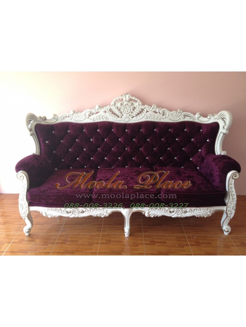 โซฟาหลุยส์โอบกุหลาบใหญ่ขนาด 3 ที่นั่ง ไม้สัก แกะลายสวยงาม ทำสีขาวเดินเงิน ดึงกระดุมคริสตัล บุผ้ากำมะหยี่ ลูกค้าสามารถเลือกเปลี่ยนผ้าหรือหนังในการหุ้มได้