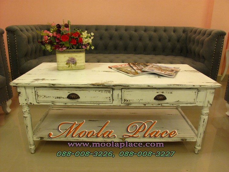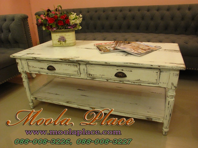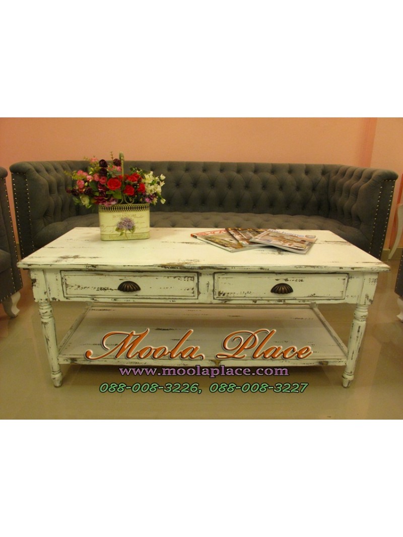 โต๊ะกลางชุดรับแขก 2 ลิ้นชัก ด้านล่างมีชั้นวางของ สีขาวทำสีเก่า สไตล์วินเทจ ขนาด 120x55x50ซม.