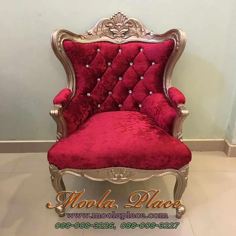 เก้าอี้หลุยส์ แกะสลัก ไม้สัก 1 ที่นั่ง ไม่มีท้าวแขน ทำสีพ่นทอง บุผ้ากำมะหยี่