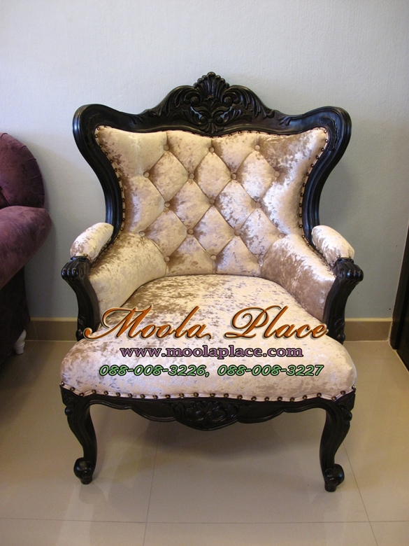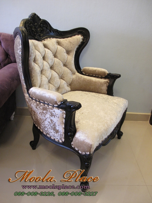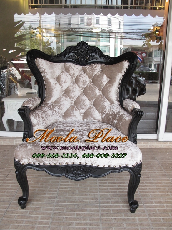 โซฟาหลุยส์โอบแคททรียา 1 ที่นั่ง ไม้สัก แกะสลักลายสวยงาม ทำสีดำ ดึงกระดุมตอกหมุด บุผ้ากำมะหยี่