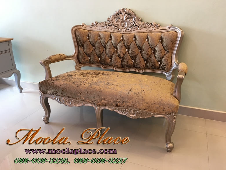 สตูลหลุยส์มีแขนแกะสลัก ขนาด 135 ซม. เย็บกระดุมคริสตัล ทำสีขาวเดินเงิน บุผ้ากำมะหยี่ อย่างด..