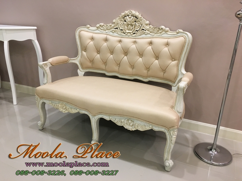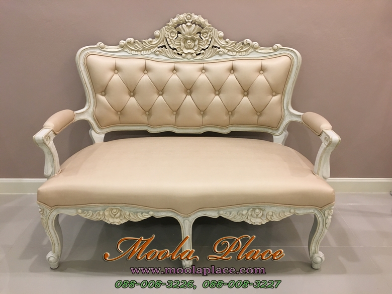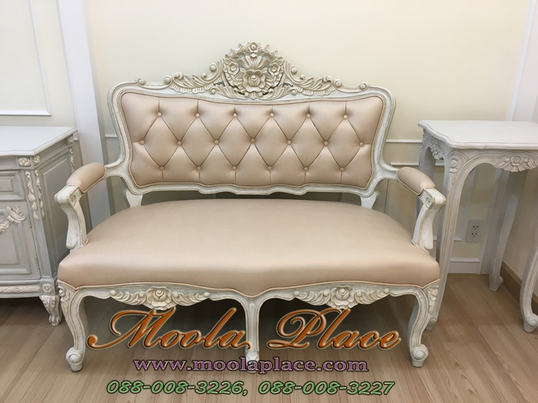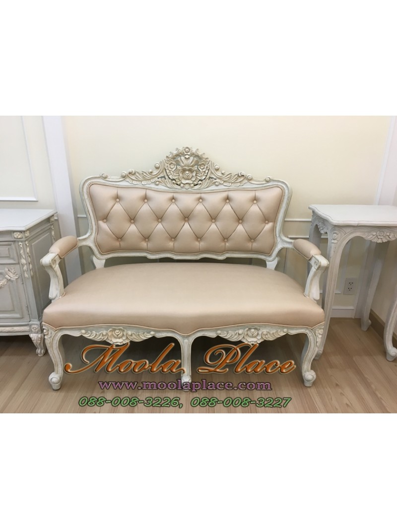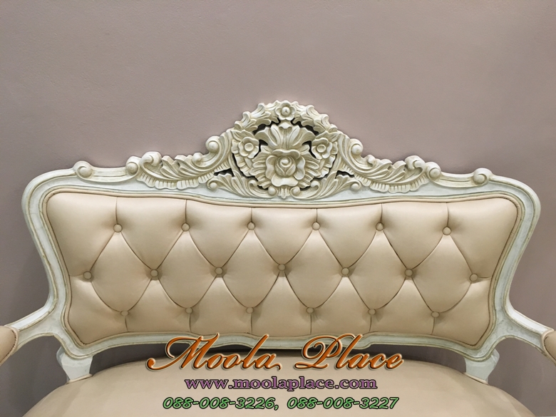 โซฟาหลุยส์โอบแคททรียา 2 ที่นั่ง ไม้สัก แกะสลักลายสวยงาม ทำสีขาวเดินทอง ดึงกระดุมตอกหมุด บุหนัง PU..
