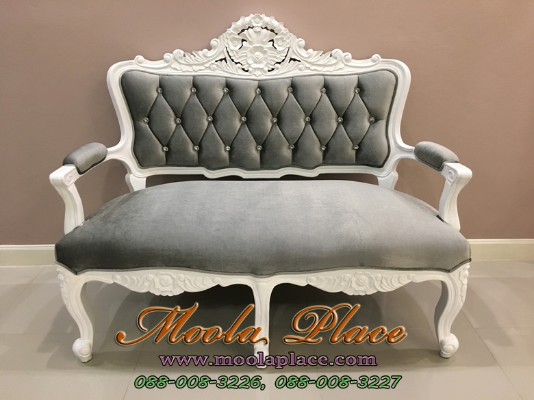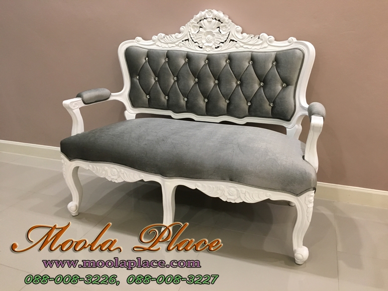 สตูลหลุยส์มีแขนแกะสลัก ขนาด 135 ซม. เย็บกระดุมคริสตัล ทำสีขาวเดินเงิน บุผ้ากำมะหยี่ อย่างด..