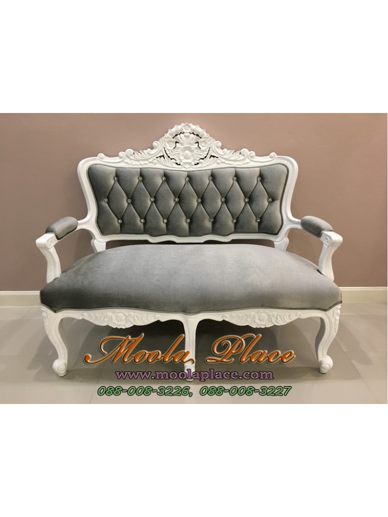 โซฟาหลุยส์รับแขกแกะสลัก ไม้สัก 2 ที่นั่ง ทำสีขาว บุผ้ากำมะหยี่ตัวท็อป