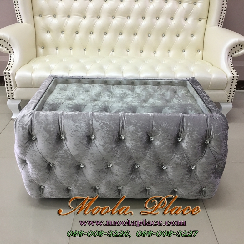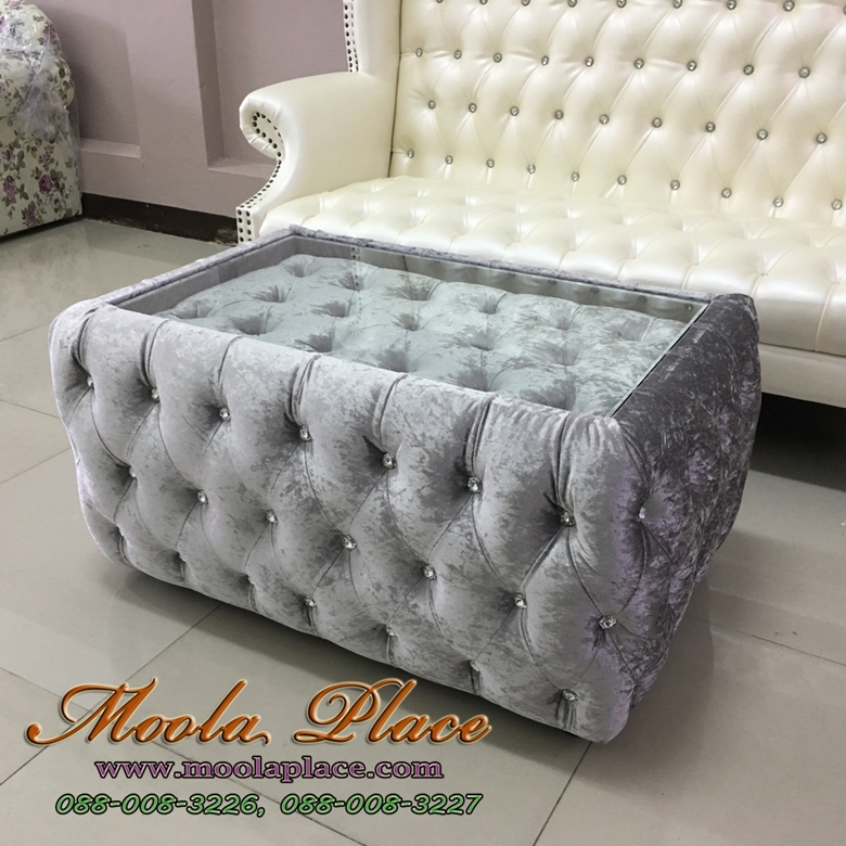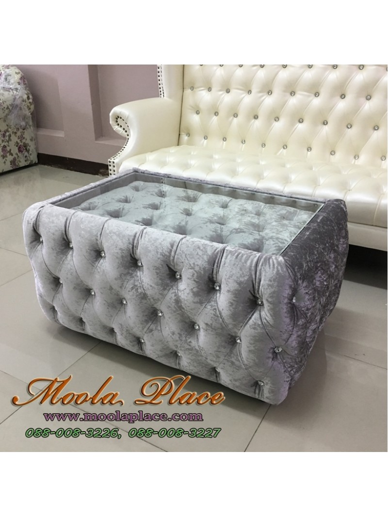 โต๊ะกลางหน้ากระจกเจียรริมรอบ เย็บกระดุมบุผ้ากำมะหยี่ ขนาด 80*50*45 ซม