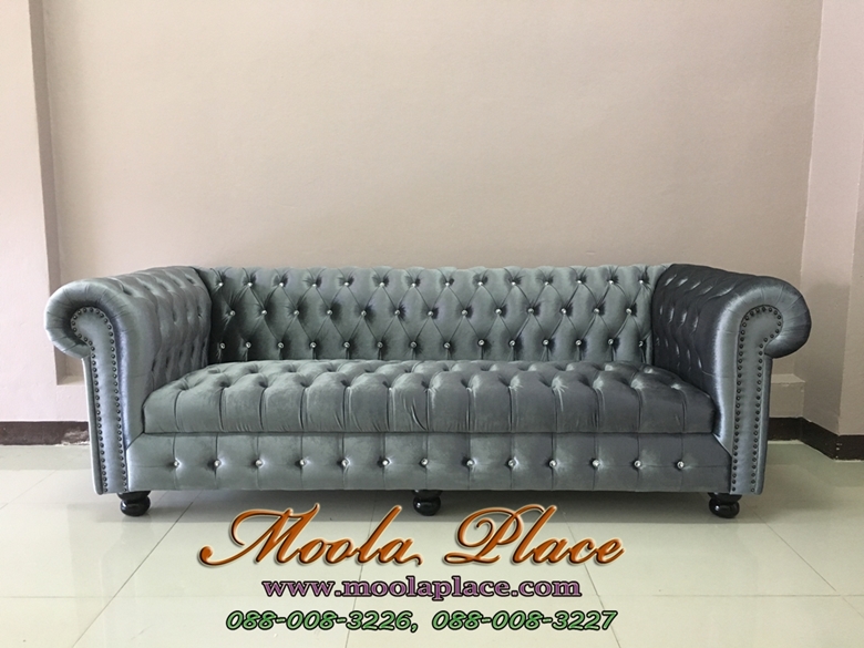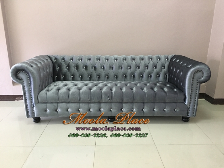 โซฟาอาร์มแชร์พนักเท่า ขากลึง เย็บกระดุม ขนาด 220 ซม 3 ที่นั่ง บุผ้ากำมะหยี่ตัวท็อป ลูกค้าสามารถเลือกเปลี่ยนผ้าหุ้มได้