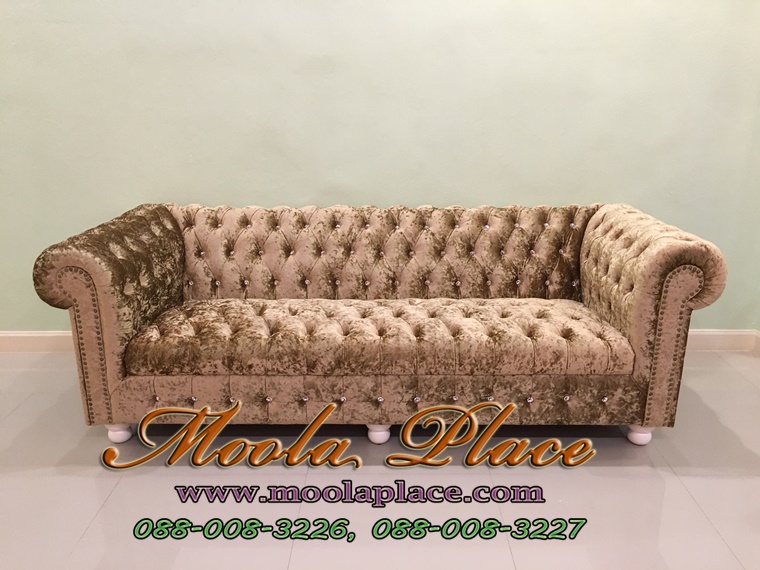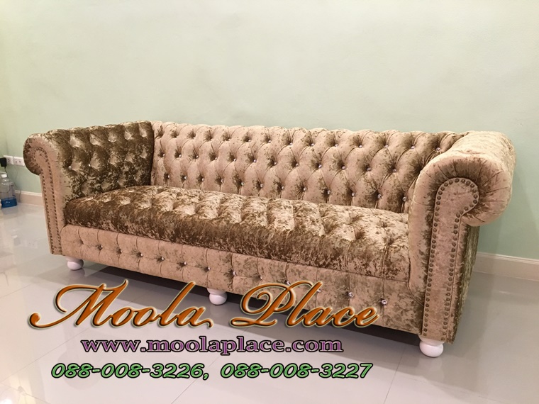 โซฟาอาร์มแชร์พนักเว้าขากลึงเย็บกระดุมคริสตัลที่พนัก บุกำมะหยี่ ขนาด 220 ซม. 3 ที่นั่ง ลูกค้..