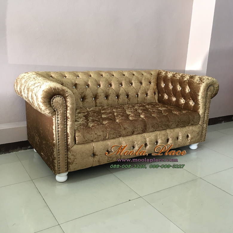 โซฟาอาร์มแชร์พนักเว้าขากลึงเย็บกระดุมคริสตัลที่พนัก บุกำมะหยี่ ขนาด 220 ซม. 3 ที่นั่ง ลูกค้..