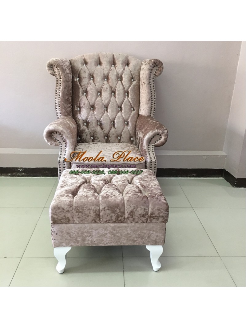 โซฟา Wing Chair ขาสิงห์ สไตล์วินเทจ บุผ้ากำมะหยี่ พร้อมที่วางเท้า