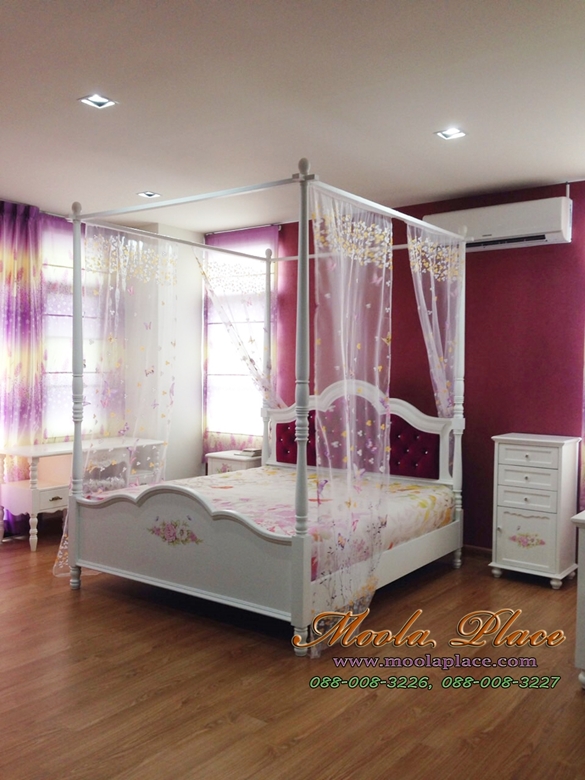 เตียงนอน มีเสาพร้อมคานไว้ใส่ม่าน พร้อมบุกำมะหยี่หัวเตียง ขนาด 6 ฟุต
